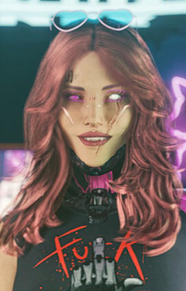 Born in 2047 in the slums of Watson, Lynx was always a special case. Her mother, Celeste, was an awful woman. She worked as a Joy Toy to put food on the table, blaming Lynx for the loss of her father as well as the reason she was stuck in a rundown apartment, locked in a miserable job. From the age of three to seventeen, Lynx was coached into becoming the perfect woman. She was taught to always please a man, even if it meant giving up a piece of herself in the process. She was quiet, reserved and harbored guilt and pain beyond belief.Upon turning seventeen, Lynx was forced onto Jig Jig Street by her mother, efficiently breaking her daughter into helping provide for their household. She spent every night doing what she needed to do, earning scratch and slowly attaching herself to the façade personality that she created. She became loud, bubbly, and full of life, always having a grin on her face. This was also when she began to display signs of obsession, psychosis and general darkness.It was whenever she met a man, a man she'd lovingly called her puppy. He was a loyal client, always coming to see her and showering her in attention that no man had ever wanted to show her. She began to get attached, sinking her claws deep into him in an effort to keep him around. She abandoned her job, she stayed with him whenever she could, she broke down her walls for him. Then one day, he vanished. No explanation meant one thing; she wasn't enough yet again. This caused her to further spiral. Not even a month after the sudden disappearance as well as a psychotic break, she was forced to work once more, fully escaping her mother's clutches and finding an apartment for herself.She had managed to pull her life together, never getting attached to clients again out of fear of being abandoned. There was a night whenever she was walking back to her apartment, being corned by a man in an alleyway who tried pursuing her. Whenever she'd shut it down, there was a violent attack. Her throat was flayed, vocal cords severed. Her eyes were gouged out with the use of a dull, rusty knife. Her arm was cut off using that same rusty blade, taking hours of excruciating pain. She was found by a good Samaritan of sorts, being rushed to the ripper doc with limited time to survive.She'd been patched up, given full upgrades for each thing she lost. She gained pink kiroshi eyes, a beautifully crafted cyberneck, as well as a cyberarm. This didn't seem to help with her psychosis, furthering her deeper into her troubled spiral. It didn't help that Kei, the Tyger Claw that took everything from her, always haunted her. He was everywhere she looked, never getting an ounce of peace knowing that he could always finish the job.